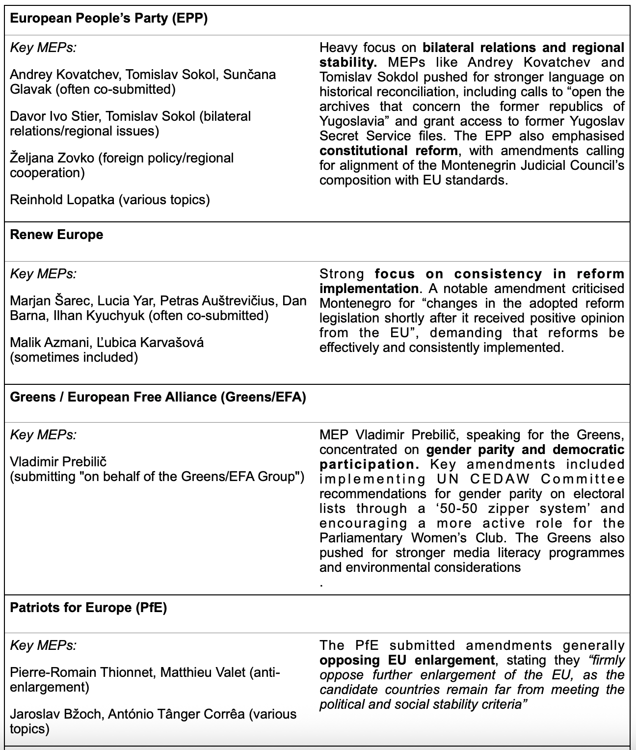 Rapporteur Marjan Šarec (Renew Europe)’s initial draft report in February 2025 largely aligned with the Commission’s findings, welcoming Montenegro’s meeting of interim benchmarks for Chapters 23–24 and closure of three additional negotiating Chapters, bringing the total to six provisionally closed.